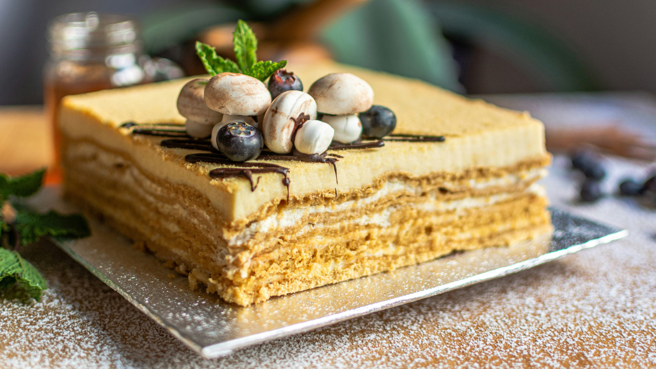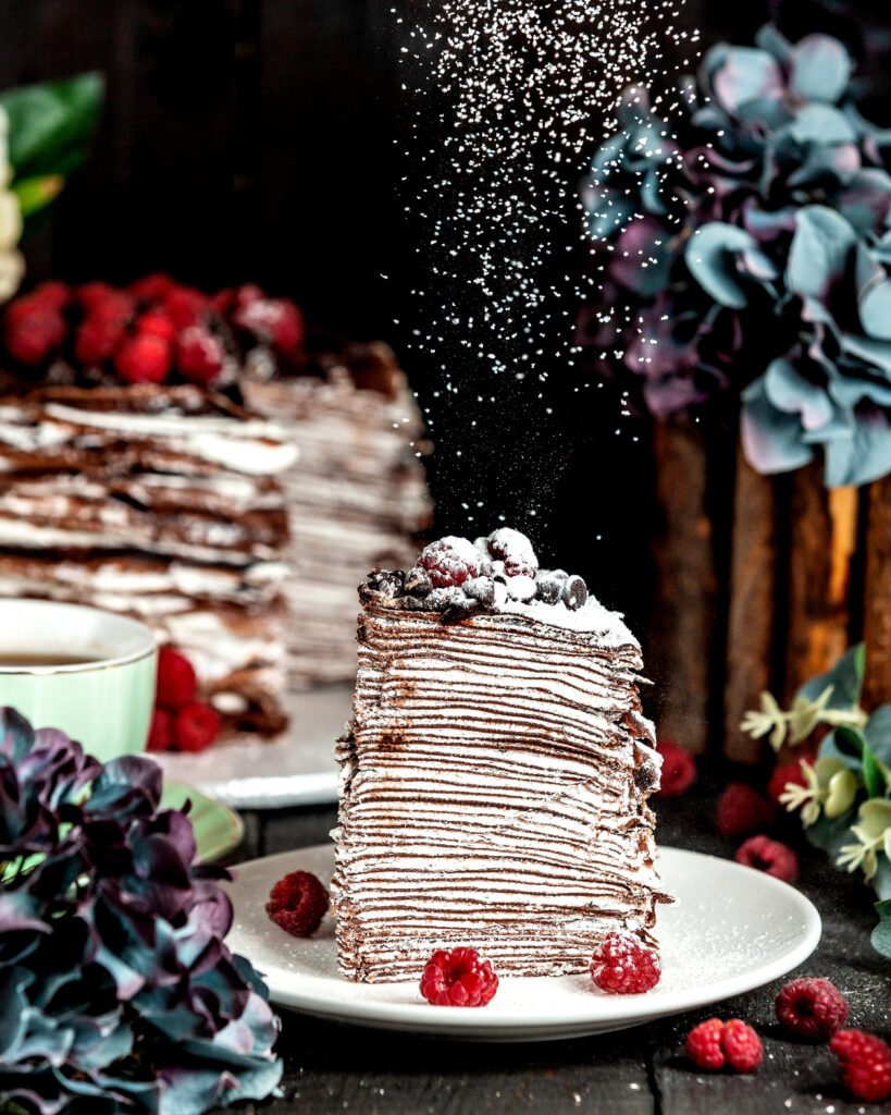Consider a cake made of numerous delicate golden crepes that have been interlaced with lavish fillings inspired by the core of Tiramisu. This cake can have fillings such as pastry cream, whipped cream, and even fruit compotes, while chocolate ganache is a frequent favorite.
