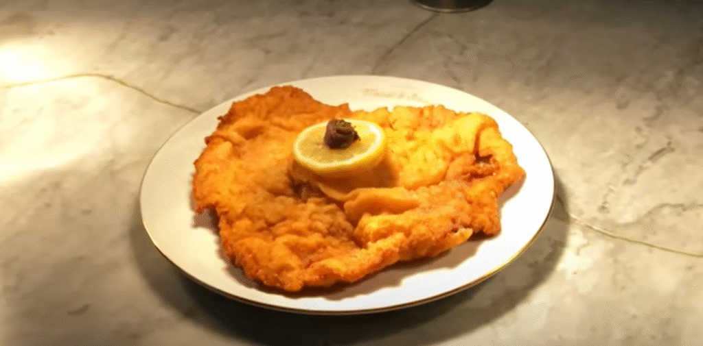 A slice of meat from central Europe which usually comes pounded thin is breaded then fried.