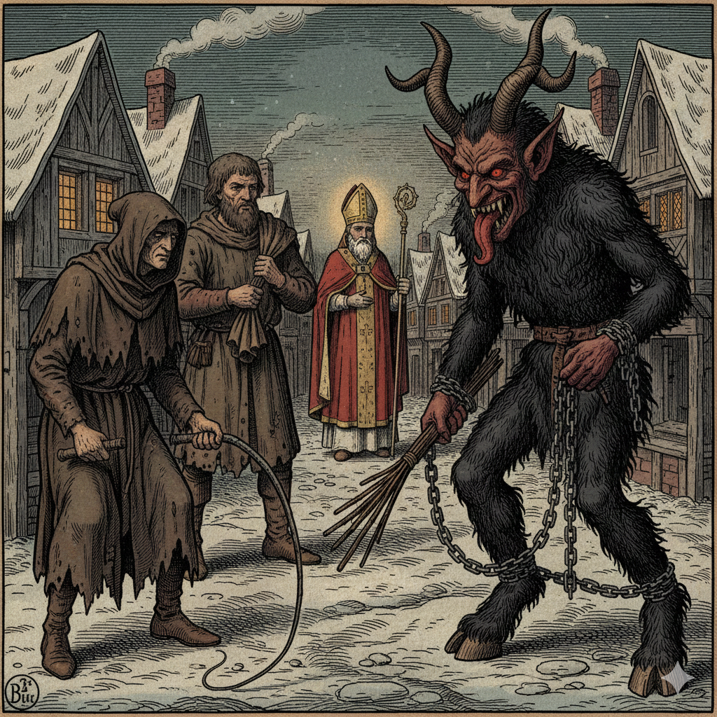 - Krampus: In the Austro-Bavarian tradition, Krampus is a horned, anthropomorphic figure who punishes naughty children by swatting them with birch rods or carrying them away in a sack.