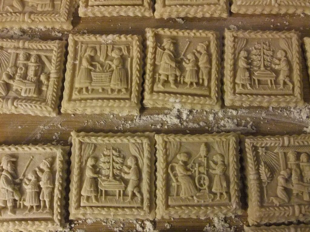 Additional Central European Christmas cookies history includes Springerle, having a centuries-long tradition in Southern Germany and Austria. These are thick, anise-flavored cookies made from a sculpted, molded dough which is pressed into intricate, decorative, and ultimately raised designs. Spekulatius, or windmill cookies, are thin, crunchy, and spiced shortcrust cookies which are often baked with traditional imagery, sometimes referred to as windmill cookies.
