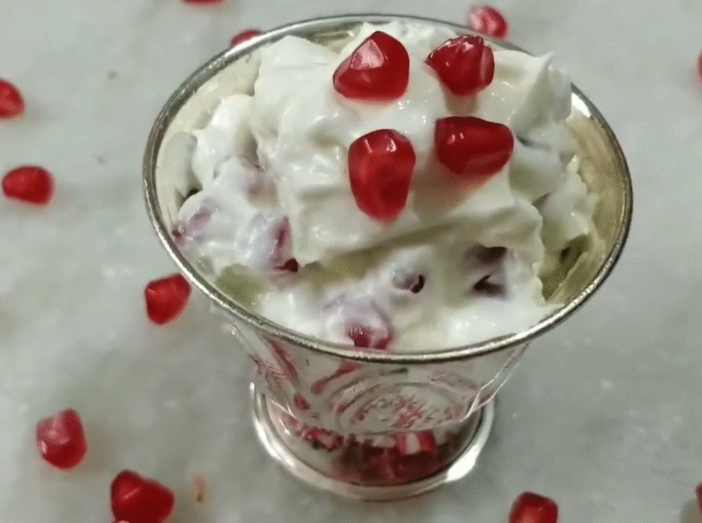 Shrikhand is characterized by creamy strained yogurt and is made using rich pomegranate molasses, adding an intense, tangy-sweet flavor and a deep ruby hue to its color. The taste is very cooling and full of flavor, and the combination with cream makes for a bold flavor. Tremendous fragrant elements can be appreciated on top of the overpowering tang of the vibrant cream. Fresh pomegranate seeds enhance the dish’s visual appeal with their juiciness and make the dessert pop. The cooled mixture should be stored in a glass bottle to ensure a shelf life of up to a year. Nothing non-sterile should touch the container until it’s needed. The molasses should remain refrigerated as long as they are not used.