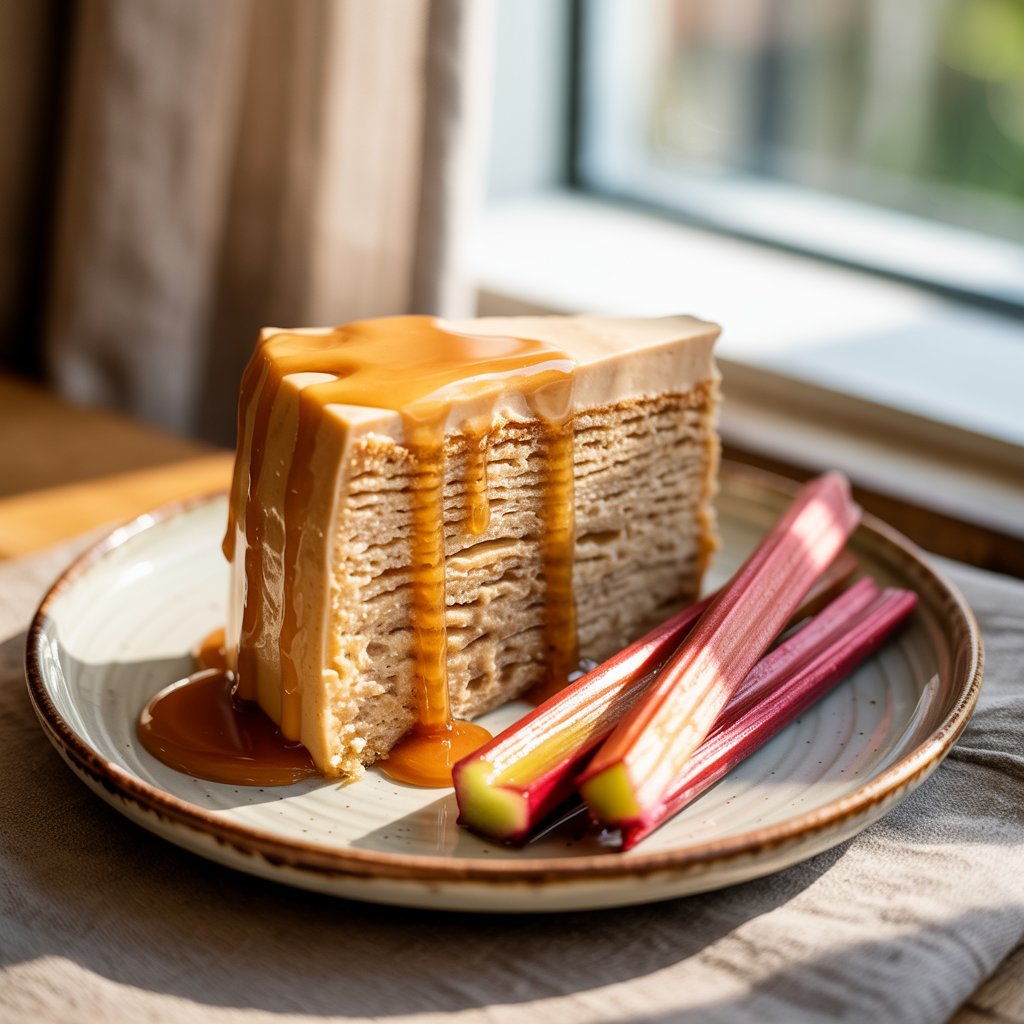 Tahini Chiffon Cake with Burnt Honey Cream and Poached Rhubarb