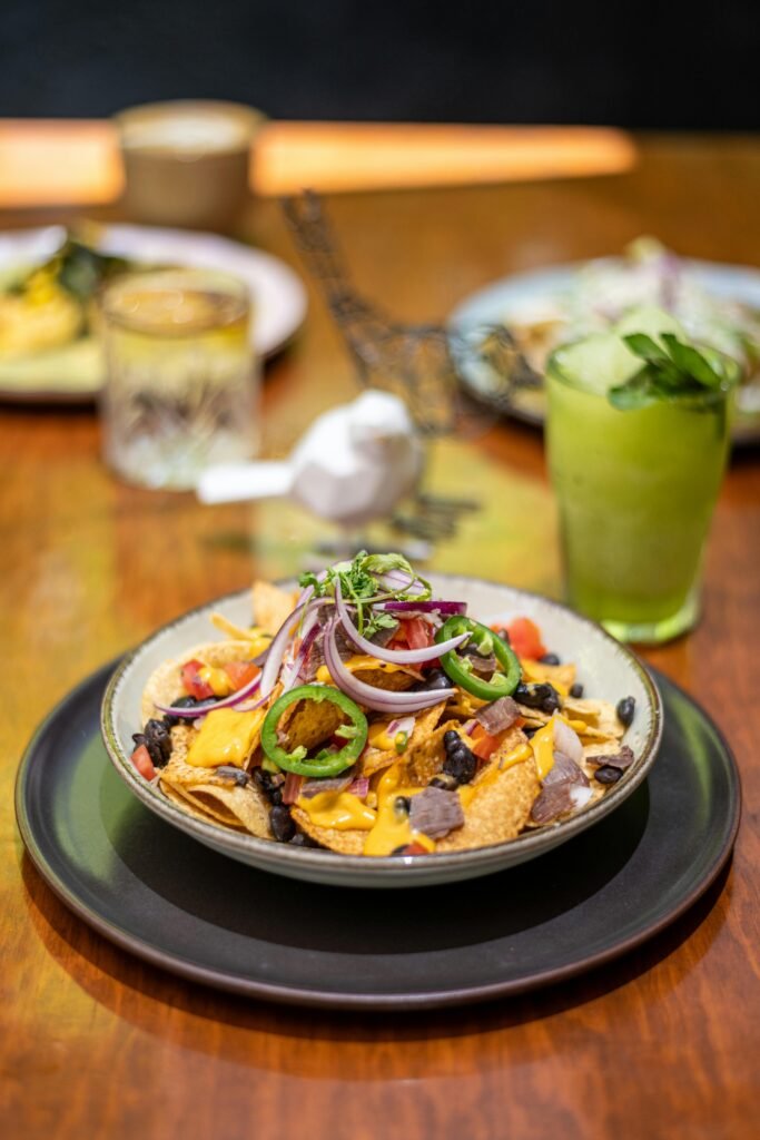 The nachos themselves are topped with Mexican classics; a mix of Monterey Jack and cheddar cheese, gently heated until it blurs between melted and solid, is more than enough for a savory nacho mountain. Pickled jalapeños bring a touch of acidity, while fresh tomatoes, onions, cilantro, and lime make pico de gallo even livelier. It brightens the overall flavor profile. Applying creamy avocado or spicy aioli brings richness and further complexity. Delicate spicy tuna fuses with the boldly cheesy nachos to create a dish that is both elegant and satisfying enough for a casual gathering.