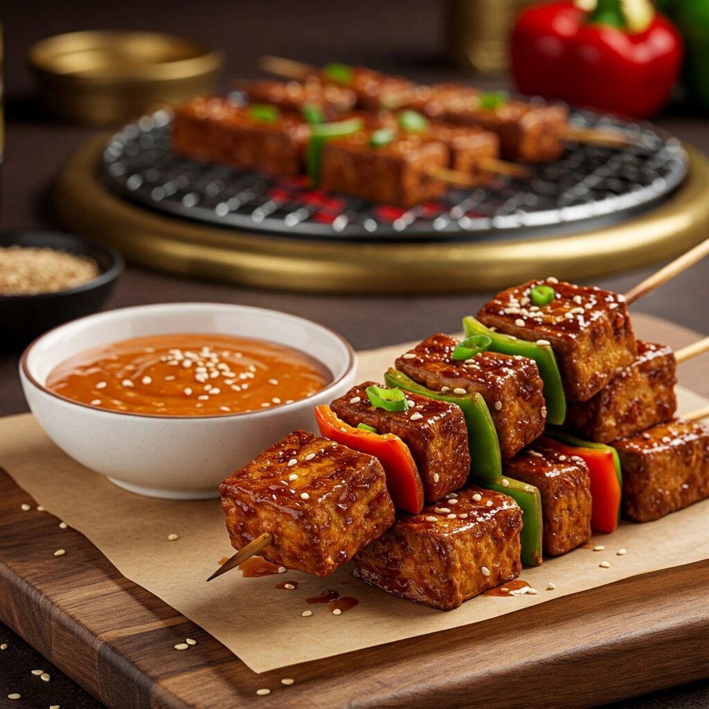 Originally from the streets of Indonesia, Satay is mostly meat-based street food grilled on a stick. But even these still taste amazing when prepared like this, tofu stays with its sweet and smoky Korean BBQ.